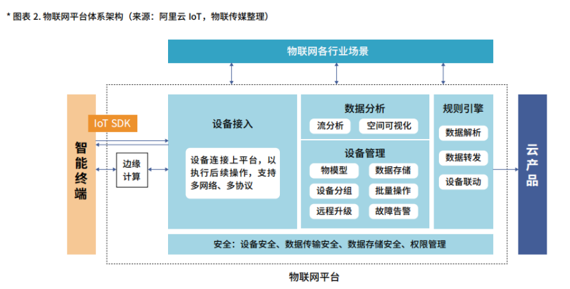 (3)接着是平台的核心物联网功能,包括最重要的设备管理、配置管理、消息传递、OTA 软件更新等。