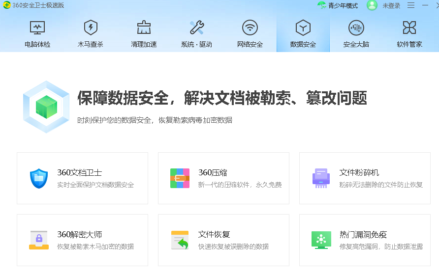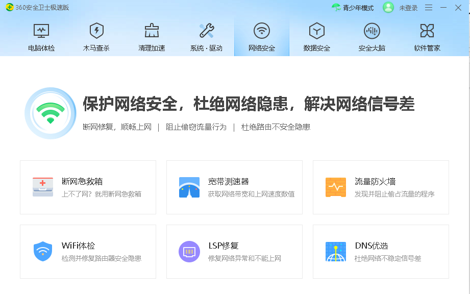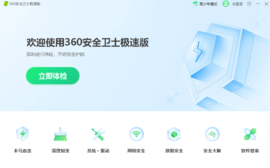 接下来谈一谈我对主界面的感受,首先极速版页面很符合我的审美,主界面上方是360安全卫士一贯的一键体检功能,下方是功能列表,一眼看过去还是包含很多功能的,点击十分方便。