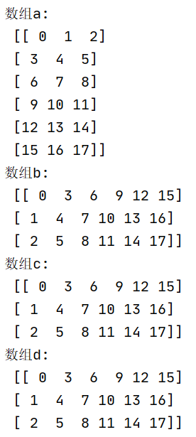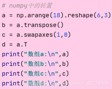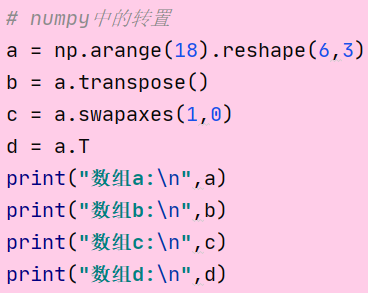 以上三种方法都可以实现二维数组转置的效果. 大家能够看出来, 转置和交换轴的效果一样.