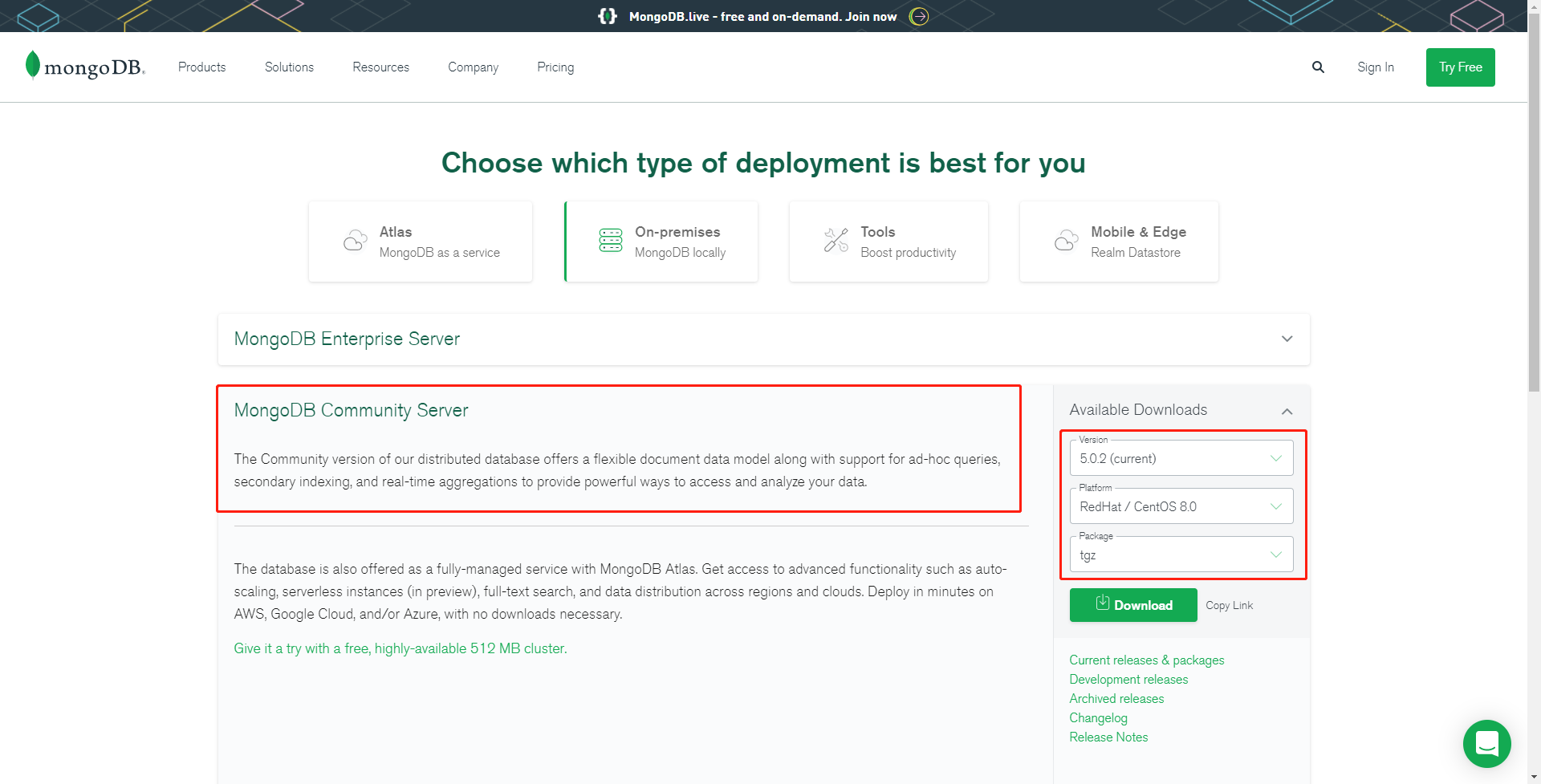 这里下载社区版,由于是在CentOS8.0上安装,所以选择RedHat/CentOS8.0的tgz版本。