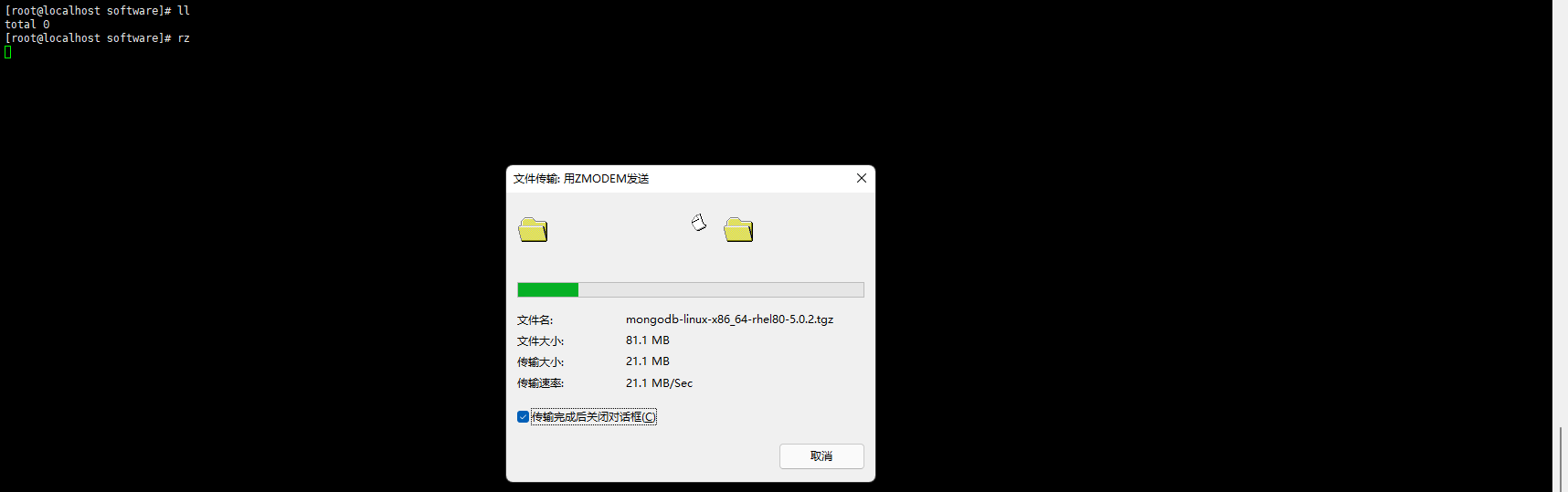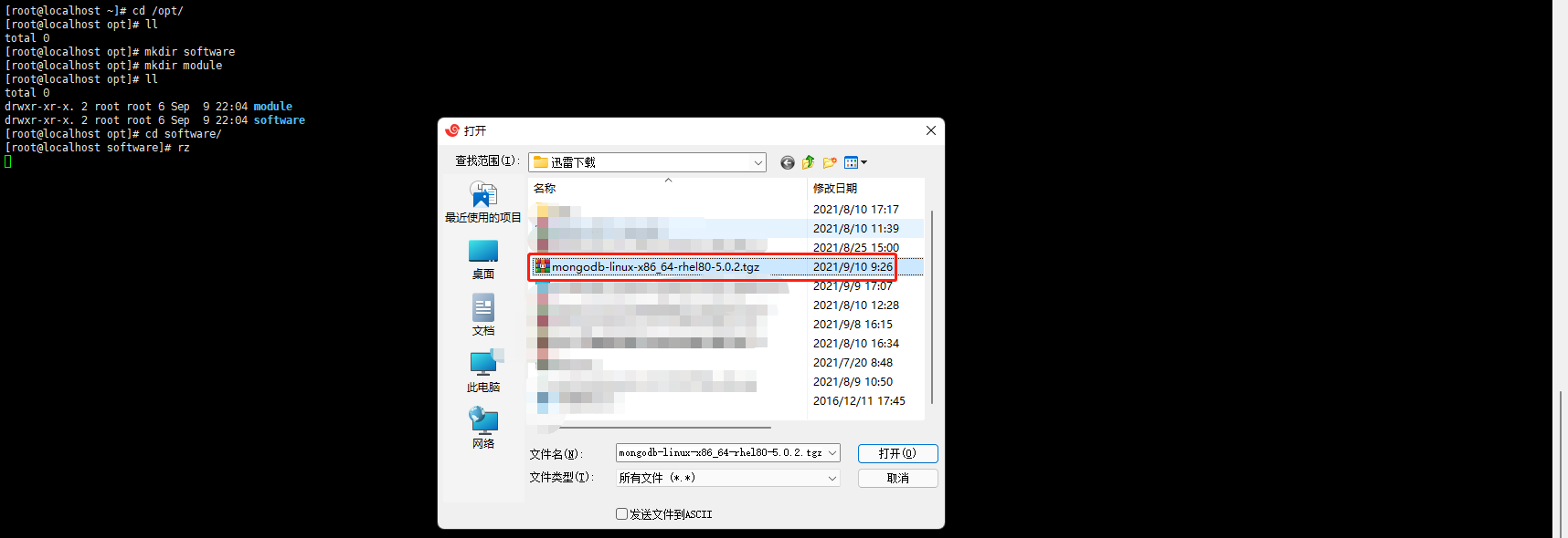输入rz命令回车,弹出文件选择框,选择mongodb安装包,点击打开,即开始上传文件。