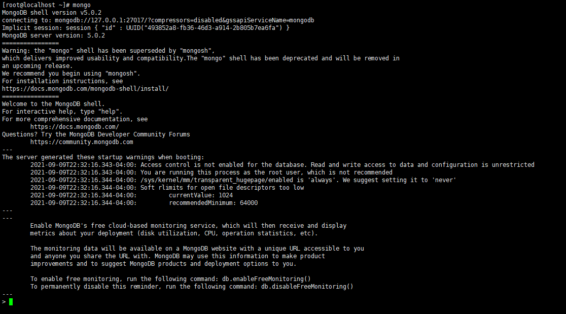 [root@localhost ~]# mongo