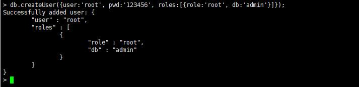 > db.createUser({user:'root', pwd:'123456', roles:[{role:'root', db:'admin'}]});