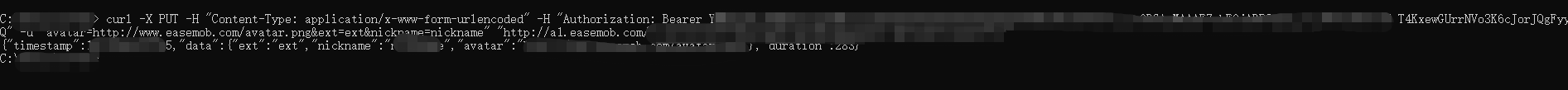 curl -X PUT -H 'Content-Type: application/x-www-form-urlencoded' -H 'Authorization: Bearer WMte3bGuOukEeiTkNP4grL7iwAAAAAAAAAAAAAAAAAAAAGL4CTw6XgR6LaXXVmNX4QCAgMAAAFnKdc-ZgBPGgBFTrLhhyK8woMEI005emtrLJFJV6aoxsZSioSIZkr5kw12' -d 'avatar=http://www.easemob.com/avatar.png&ext=ext&nickname=nickname' 'http://a1.easemob.com/easemob-demo/testapp/metadata/user/user1'