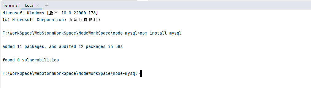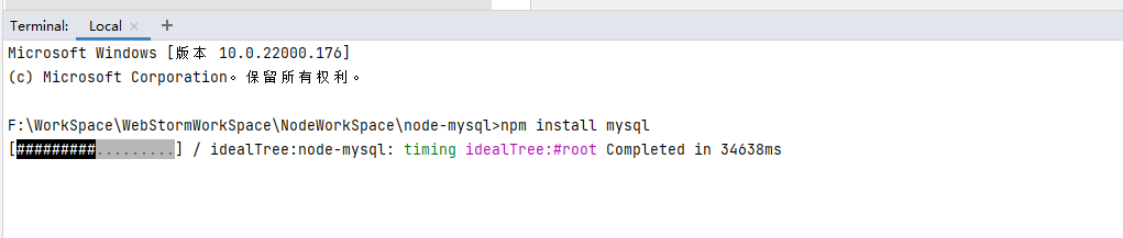 Node.js连接MySQL使用的是mysql模块,在WebStorm的Terminal中使用npm安装mysql: