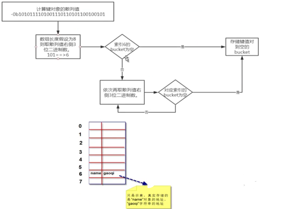 由于数组长度为 8, 我们可以拿计算出的散列在的最右边 3 位数字作为偏移量, 即 "101", 十进制是数字 5. 我们查看偏移量 5, 对应的 bucket 是否为空. 如果为空, 则将键值对放进去. 如果不为空, 则依次取右边 3 位作为1偏移量, 即 "100", 十进制是数字 4. 再查看偏移量为 4 的 bucket 是否为空. 直到为空的 bucket 将键对值放进去. 流程如下: