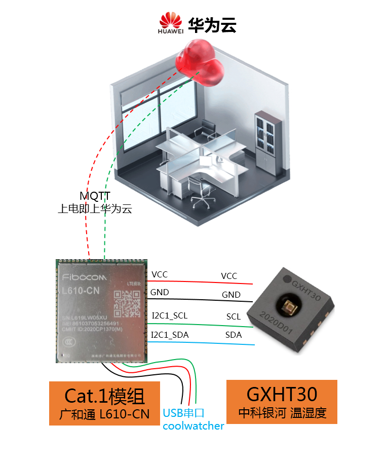 | 整体方案如下图:  (1)Cat.1模组(广和通L610-CN)通过I2C1与GXHT30(中科银河/温湿度传感器)通讯,openCPU开发获取环境温湿度,上报华为云。