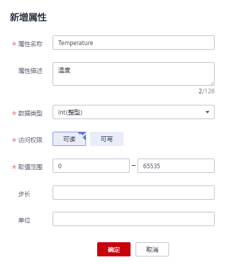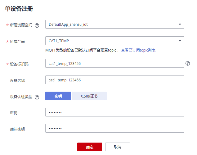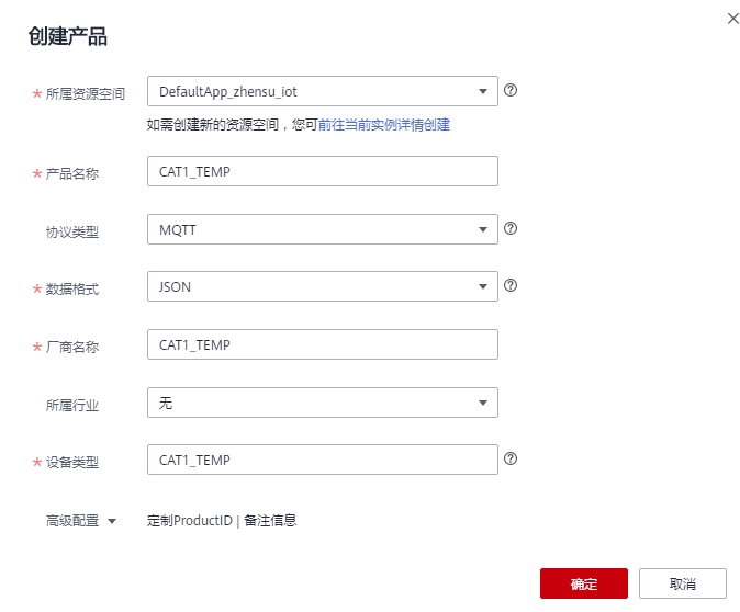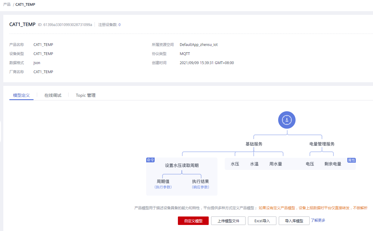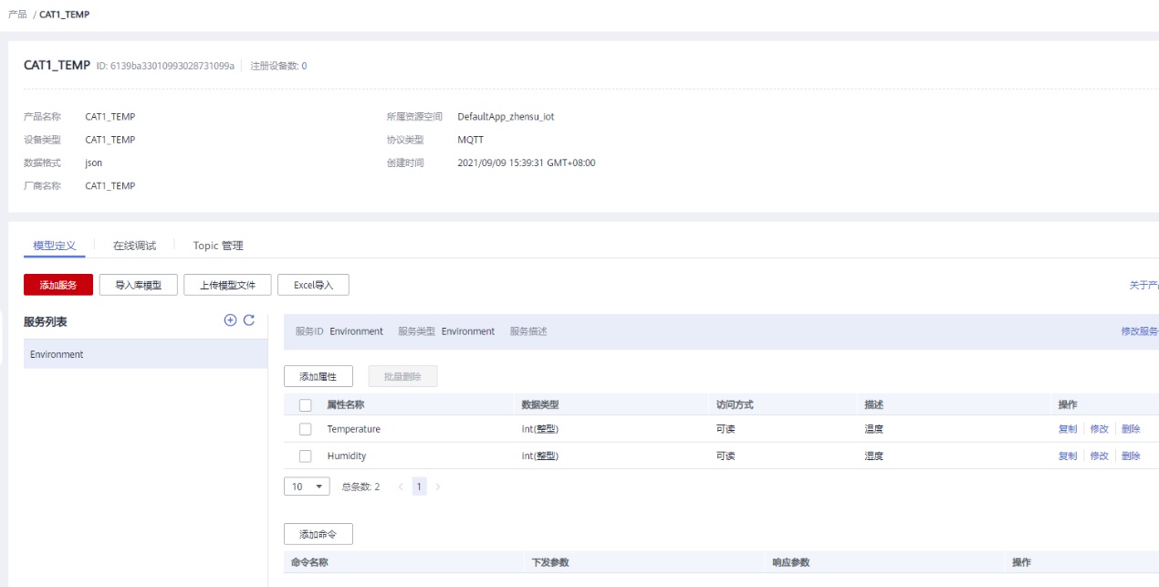 (1)云端的配置。选择产品:设备接入 IoTDA。 https://www.huaweicloud.cn/product/iothub.html (2)选择北京四。  (3)创建产品。注意协议类型,选择MQTT。数据格式,选择JSON。  (5)本次采用自定义模型。  (6)添加服务Environment。添加2个属性:Temperature,数据类型int(整形)。Humidity,数据类型int(整形)。   (7)注册设备。密钥输入12345678。  (8)设备创建成功。 注意:设备ID需要保存,代码中需要用到。  (9)在设备列表中,可以看到设备未激活。