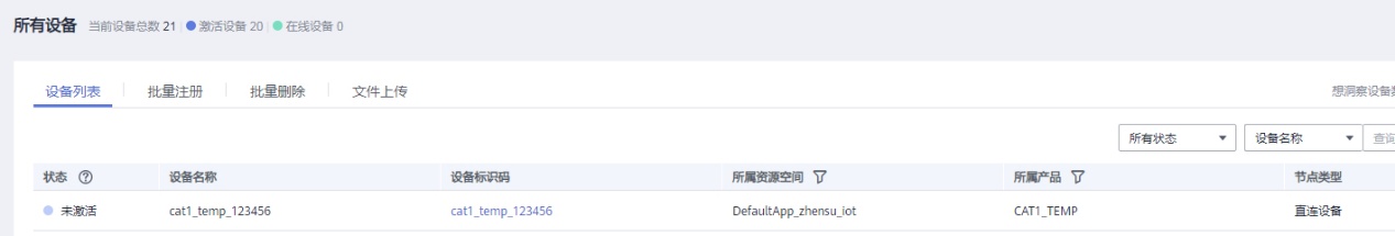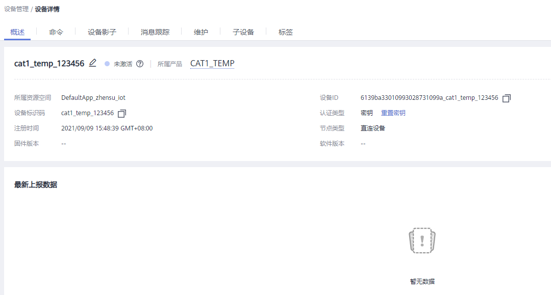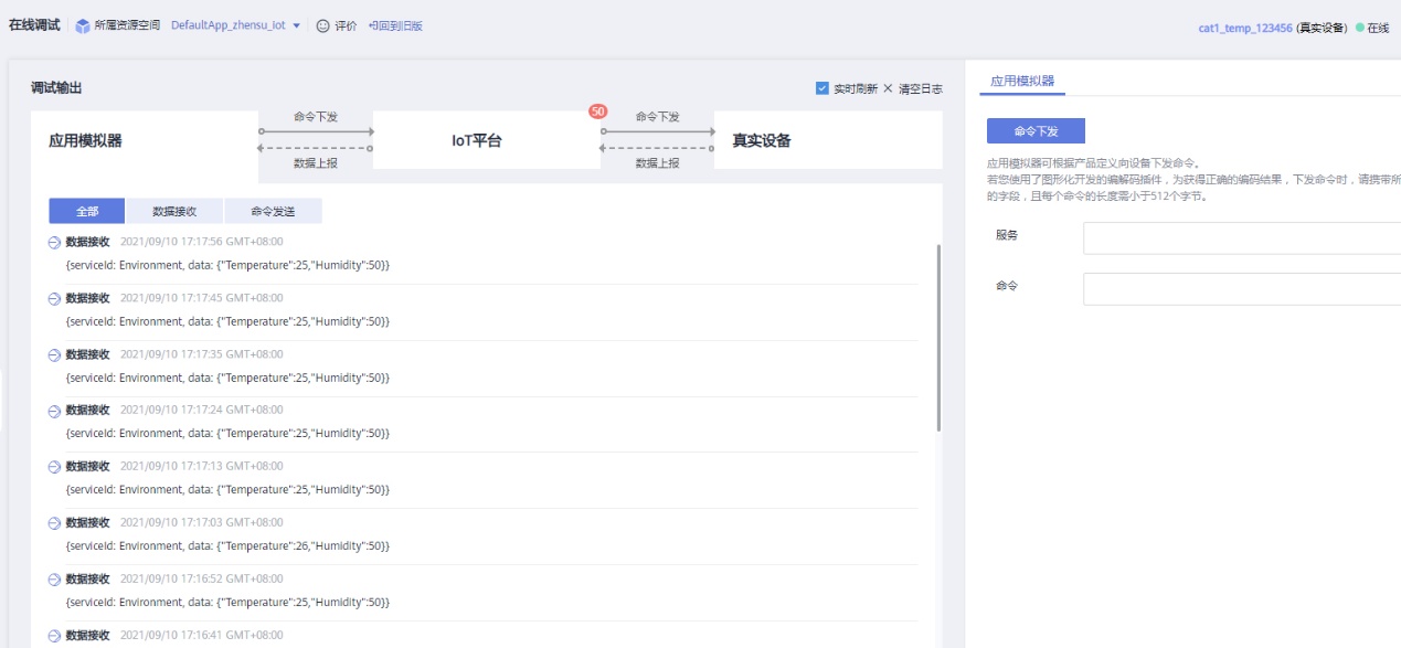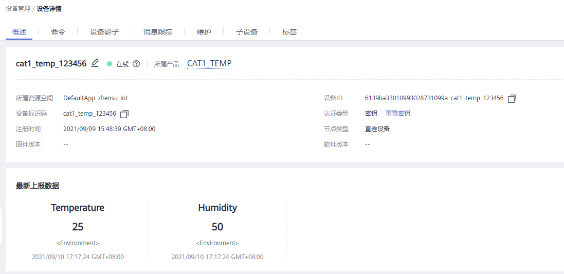 (1)华为云上查看设备详情,可以看到设备已在线。  (2)华为云上打开产品选项,选择在线调试,点击设备。可以看到设备已经在线,data正在上报到华为云。  |