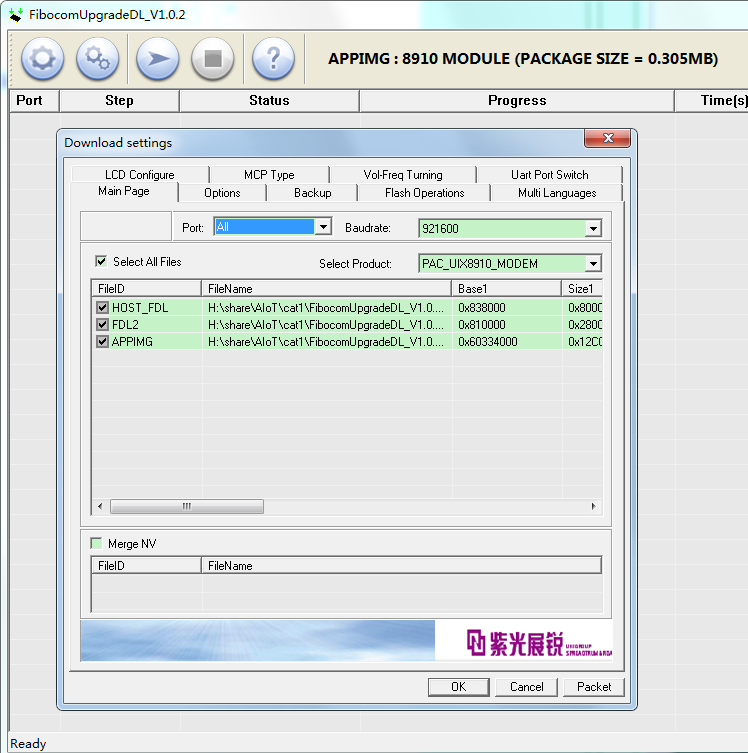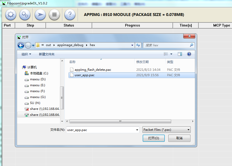 (3)打开升级软件FibocomUpgradeDL_V1.0.2.exe。选择user_app.pac