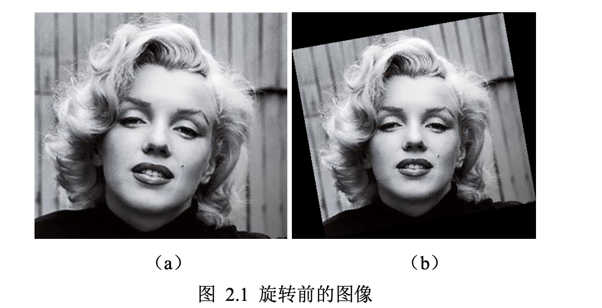 图像旋转是一种图像处理方式,它的意思就是将图像固定一点,整体围绕该点旋转一定的角度。举个现实的例子,图2.1(a)中人脸图像倾斜的,但是一般情况下,人脸检测与识别处理的图像都是左右对称的正面图像。这样,可以简化人脸检测与识别的处理难度,为系统后续图像处理奠定基础。所以,图像旋转需要计算旋转角度,图2.1(a)中人眼球中心点连线与水平线夹角为15度,需要将图像逆时针旋转15度。这样处理后,得到的人脸图像就是标准的正面图像。旋转图像后的结果如图2.1(b)所示。