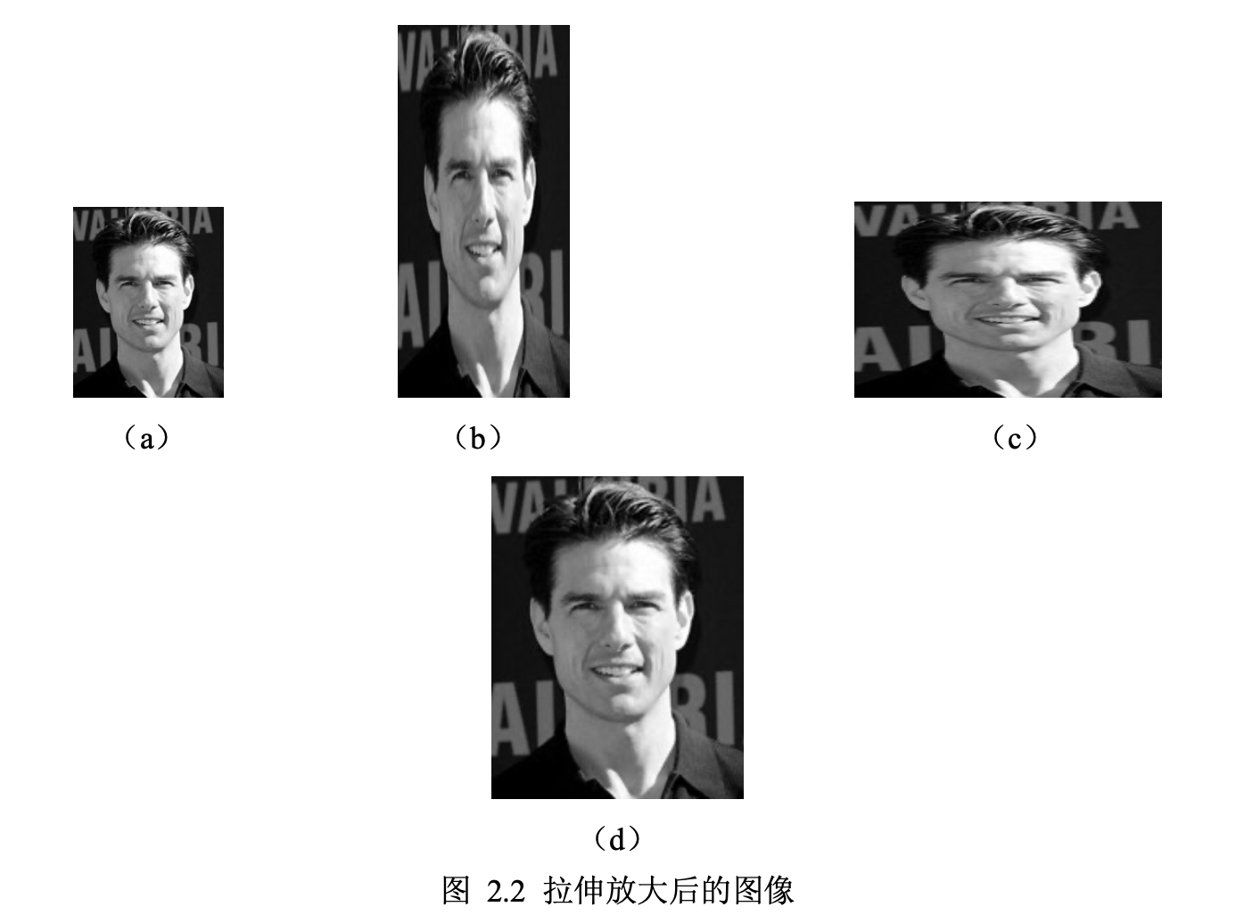 图像拉伸处理,也是为了方便人脸检测与识别过程。图2.2(a)显示了一张比较小的人脸图像,图2.2(b)显示的是人脸图像经过纵向拉伸一倍处理后的图像结果,图2.2(c)显示的图像是经过横向拉伸一倍处理后的图像结果。图2.2(d)显示的是人脸图像经过整体放大一倍处理后的图像结果。