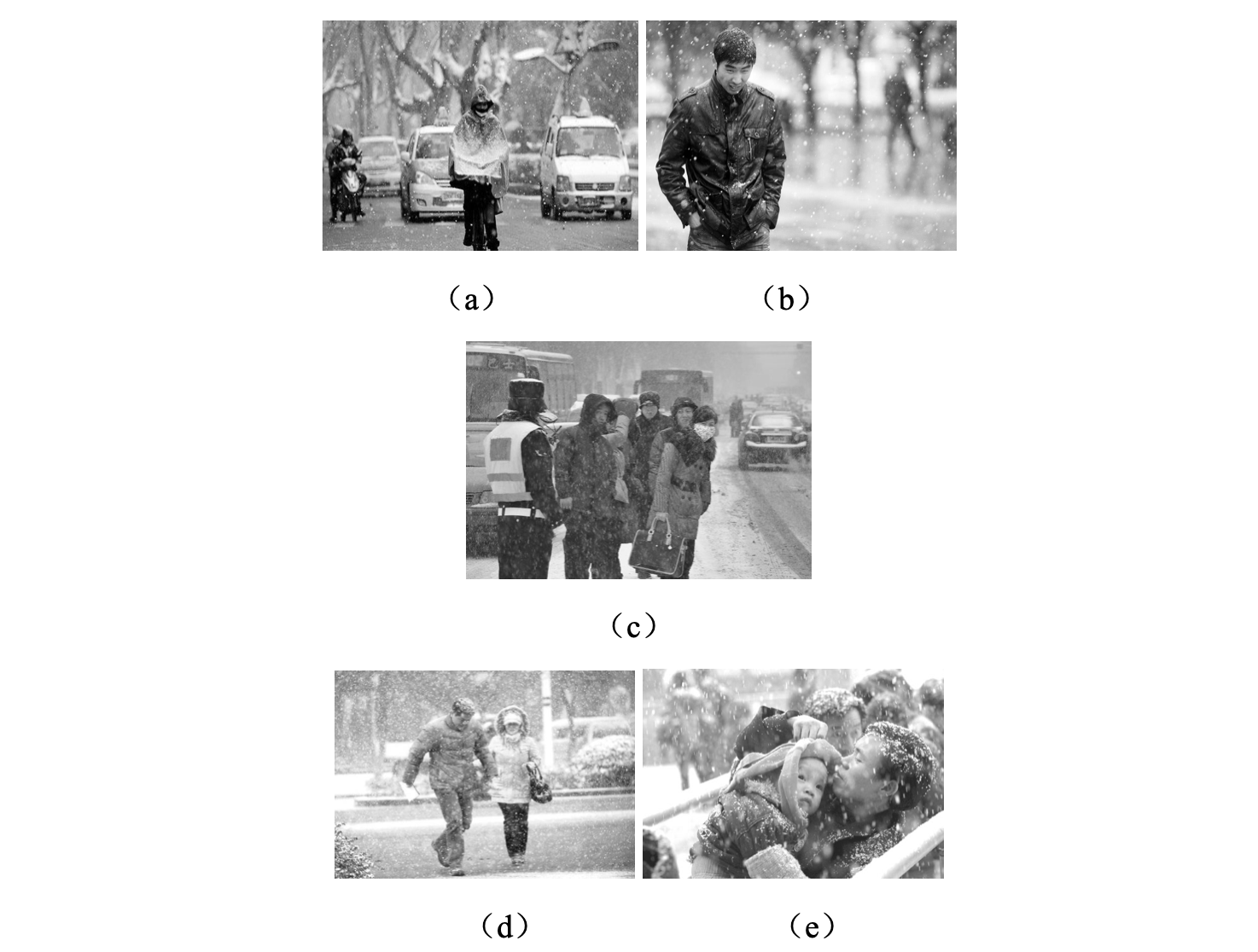 对于现实生活中的人脸图像,由于复杂环境的干扰,比如风、雨、雪、泥点等,都会对人脸的检测与识别造成噪声干扰。为了应对现实生活中遇到的各种情况,本文处理和对比了大量的在雨雪中,特别是雪的天气状况下的人脸图像。图2.5显示了部分雪中的人脸图像。