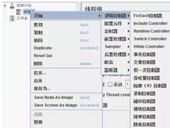 逻辑控制器,包括两类无件,一类是用于控制test plan 中 sampler 节点发送请求的逻辑顺序的控制器,常用的有 如果(If)控制器 、 switch Controller 、Runtime Controller、循环控制器等。另一类是用来组织可控制 sampler 来节点的, 如 事务控制器、吞吐量控制器。