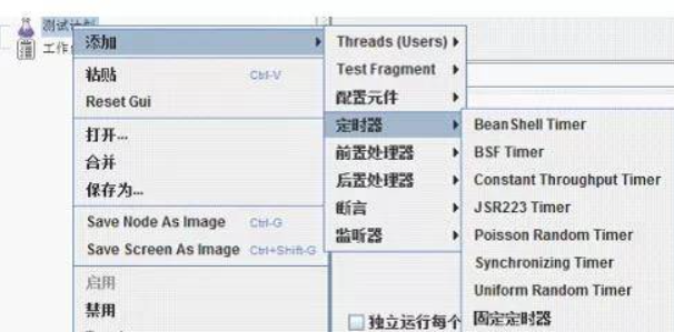 定时器(Timer)用于操作之间设置等待时间,等待时间是性能测试中常用的控制客户端QPS的手段。类似于LoadRunner里面的“思考时间”。 JMeter 定义了Bean Shell Timer、Constant Throughput Timer、固定定时器等不同类型的Timer。