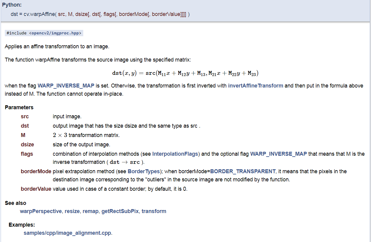 dst = cv2.warpAffine(src, M, dsize[, dst[, flags[, borderMode[, borderValue]]]])
