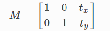 图像平移是图像位置的移动。在平移前,需要先转换矩阵 M,,其中 tx,ty 表示在(x,y)方向上的位移,如下所示: