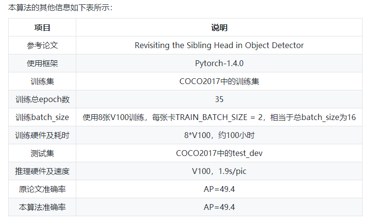 此模型基于Revisiting the Sibling Head in Object Detector 中提出的模型结构实现,该算法会载入在COCO上的预训练模型,在用户数据集上做迁移学习。我们提供了训练代码和可用于训练的模型,用于实际场景的微调训练。训练后生成的模型可直接在ModelArts平台部署成在线服务。