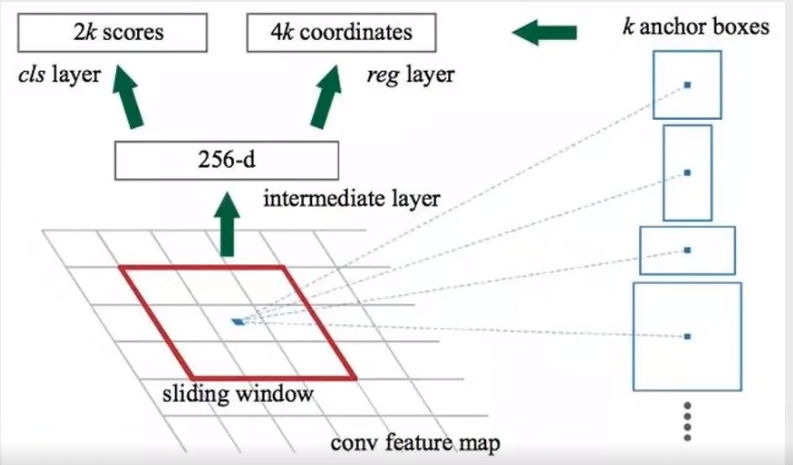 首先将Conv layers提取的特征图传递到RPN中,RPN会在这些特征映射上使用一个滑动窗口,每个窗口会生成具有不同形状和尺寸的k个anchor box。对每个anchor,RPN都会预测两点: