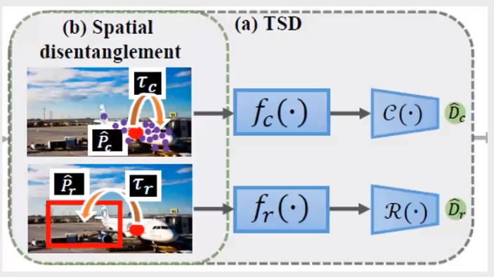 如图为使用TSD结合Faster R-CNN算法的整体示意图,重点学习的三部分为(a)TSD,(b)Spatial disentanglement 和(c)PC (progressive constraint)。