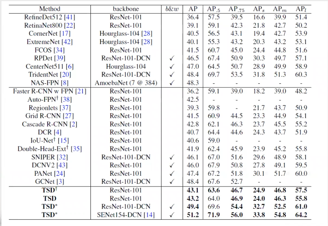 目前很多研究表明目标检测中的分类分支和定位分支存在较大的偏差,论文从sibling head改造入手,跳出常规的优化方向,提出TSD:Revisiting the Sibling Head in Object Detector方法解决混合任务带来的内在冲突,该方法可以灵活插入大多检测器中,帮助通用的检测器大幅度提升性能3%-5%,在COCO上,基于ResNet-101可以达到49.4的map,在SENet154上可以达到51.2。