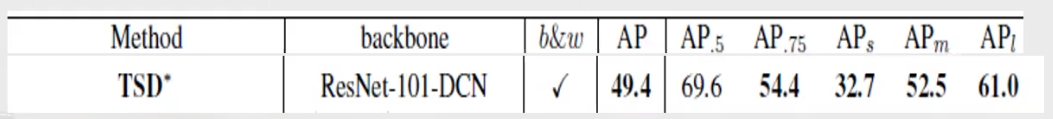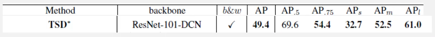 商汤开源的TSD检测代码,是基于mmdetection目标检测库的。由于开源仓库缺少我们要训练的模型设置细节,我们在开源代码的基础上,参考原论文实现细节,使用八卡复现了Table 8倒数第二行的模型精度(AP-49.4 in COCO)。