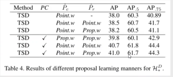 建议使用PC来提高TSD的性能。表中报告了详细的烧蚀情况。我们发现PC显著提高了ap.75 1.5,而ap.5几乎没有受到影响。这说明PC的目标是提倡对准确的盒子进行更机密的分类和精确的回归。即使在严格的测试标准下(IoU从0.5:0.95),也可以获得1.3的AP增益。