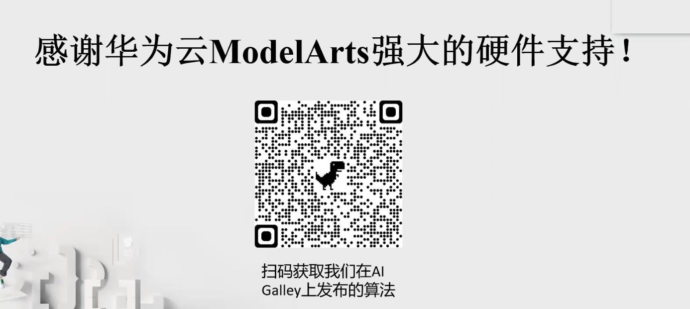 上述算法之所以可以实现,首先需要感谢华为云ModelArts强大的硬件支持,ModelArts是面向开发者的一站式AI开发平台,为机器学习与深度学习提供海量数据预处理及半自动化标注、大规模分布式Training、自动化模型生成,及端-边-云模型按需部署能力,帮助用户快速创建和部署模型,管理全周期AI工作流。最后,还要感谢华为云AI论文精读会,提供了这样的机会可以让计算机视觉、自然语言处理等领域的学者,特别是学生有机会和条件去学习优秀的论文,帮助自己成长,提高自己的学科专业知识和研究能力。