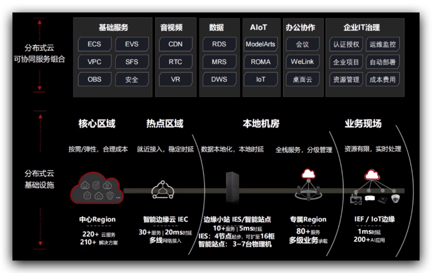 华为云边缘的多种形态可分为基础设施与分布式云可协同服务组合。
