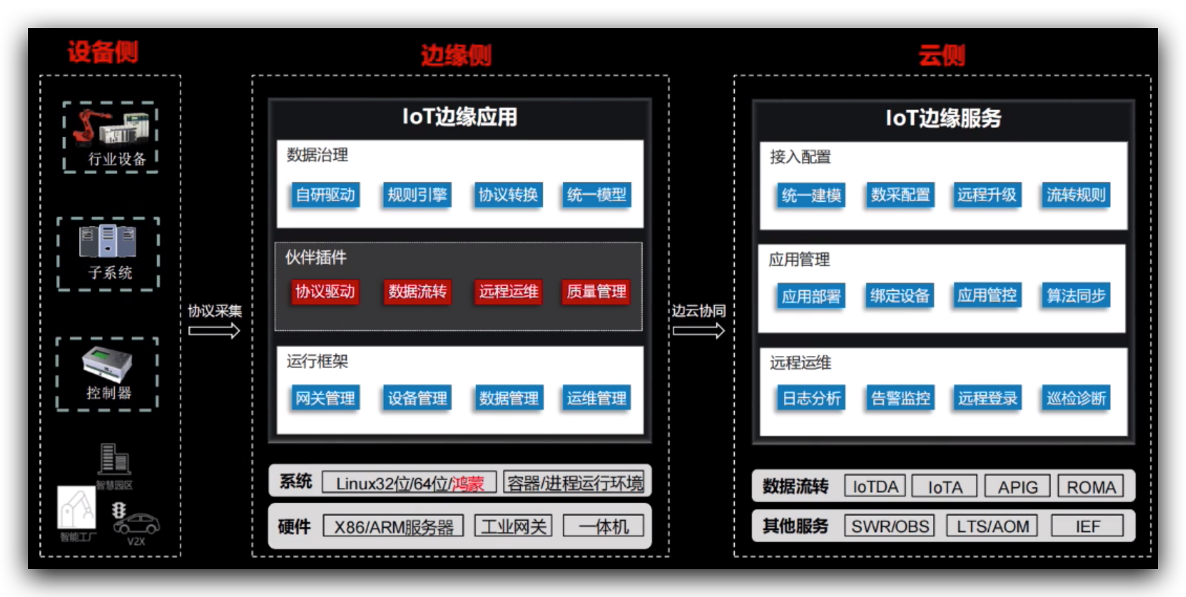 华为云IoT边缘云服务形态主要分为三大部分,设备侧、边缘侧、云侧。
