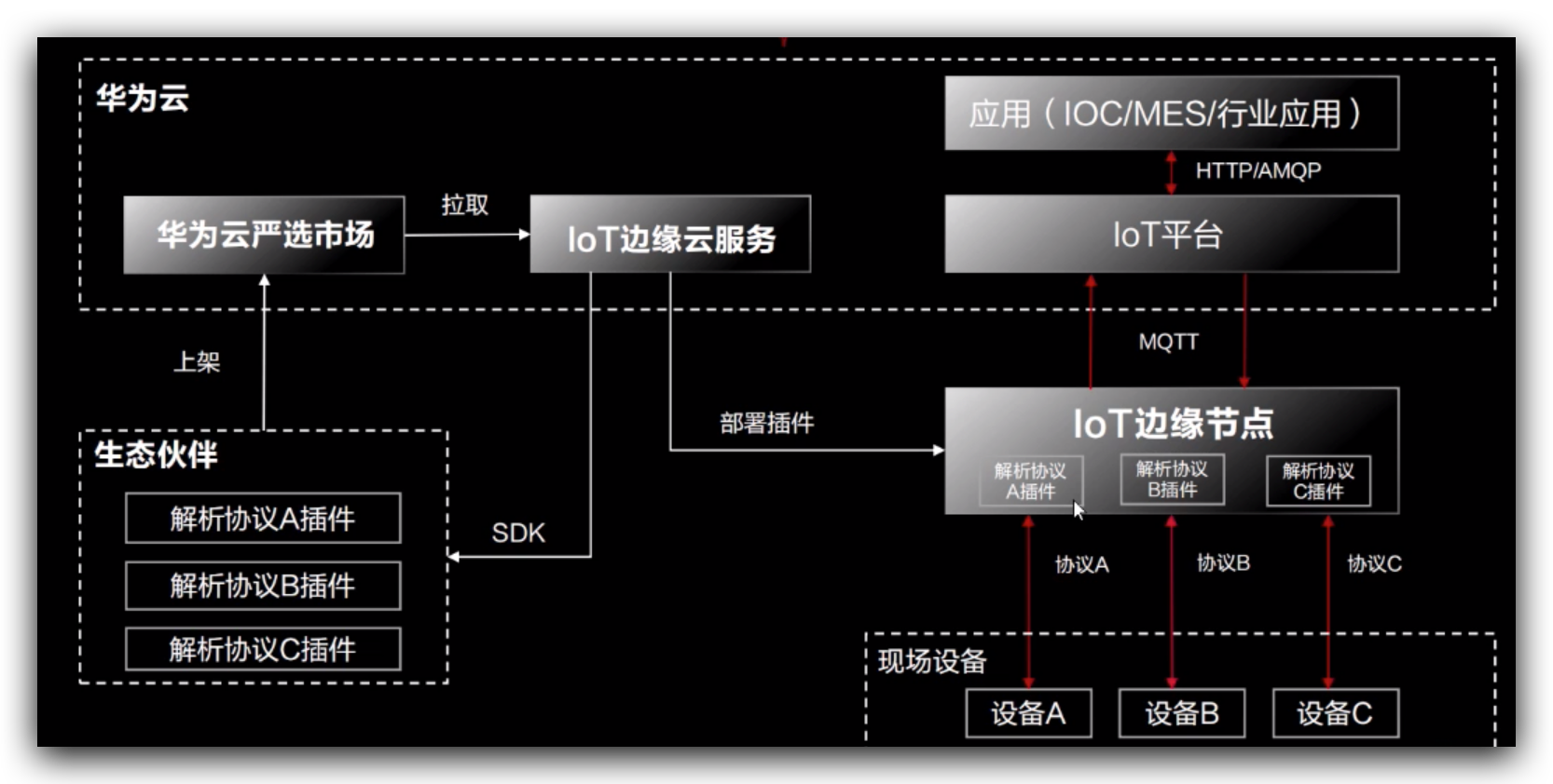华为IoT边缘 IoTEdge,多设备多协议接入能力,提供设备接入框架,终结多种私有云协议和数据模型,统一定义到云平台,并推送到边缘,提升设备效率和减低集成成本。