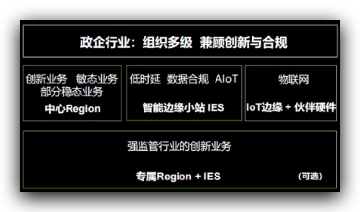 政企行业主要表现为:组织多级,兼顾创新与合规。具备创新业务、敏态业务、部分稳态业务在中心Region,低时延、数据合规、AIoT在智能边缘小站,物联网在IoT边缘+伙伴硬件。