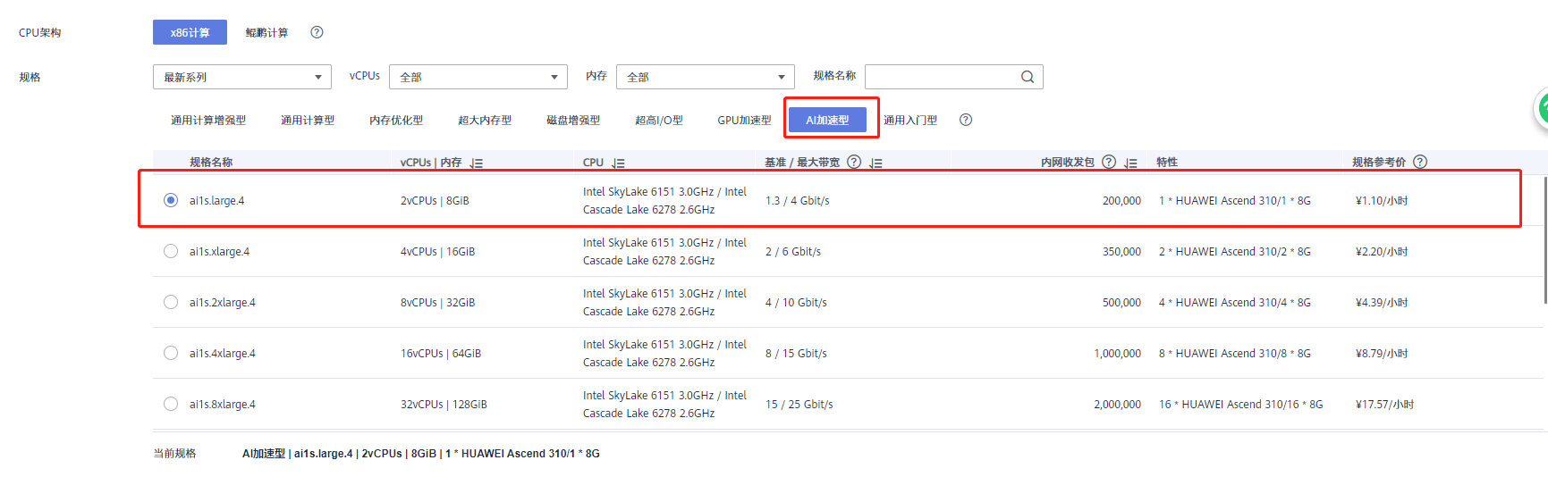 规格 AI加速型 ai1s.large.4