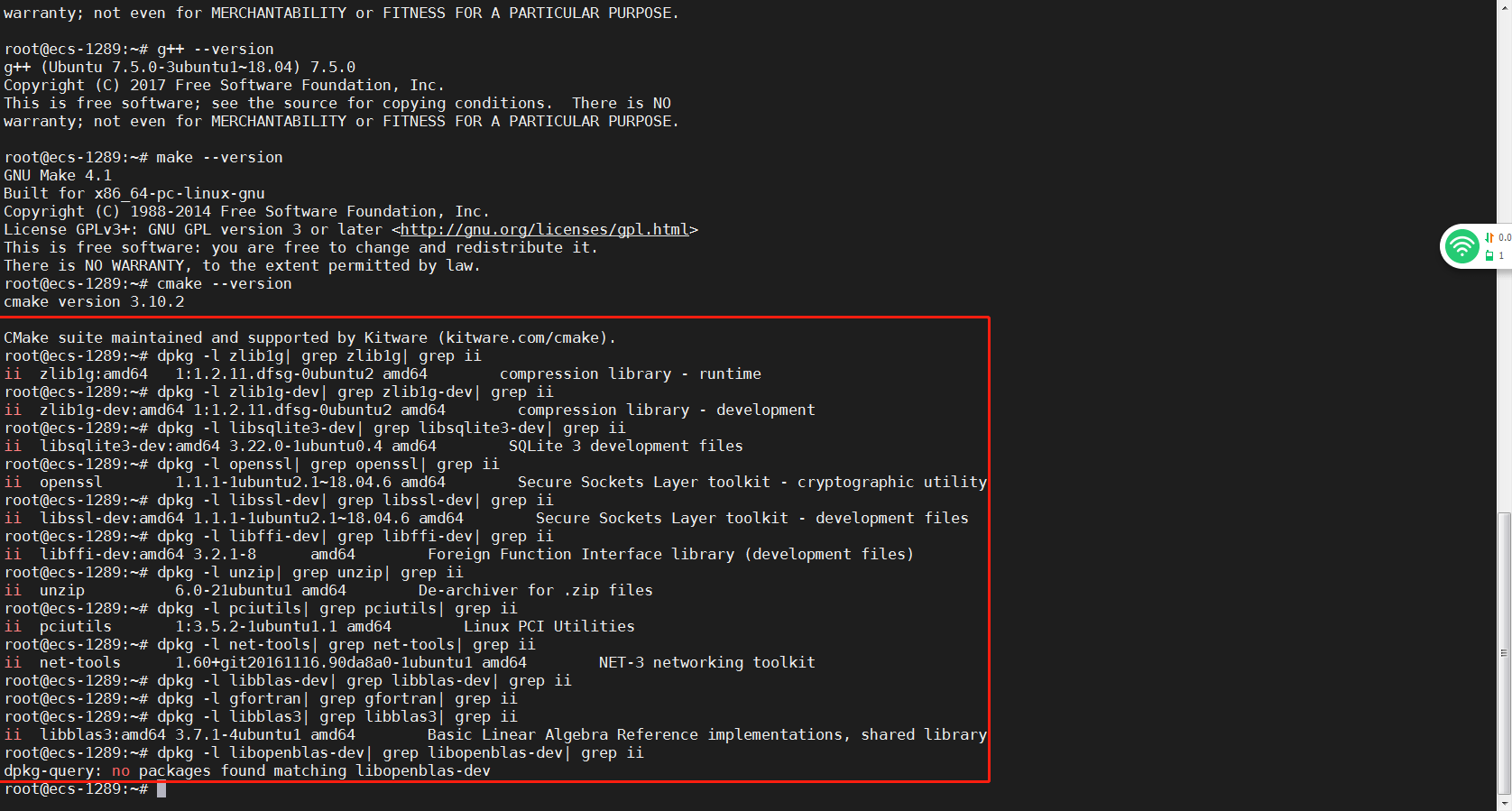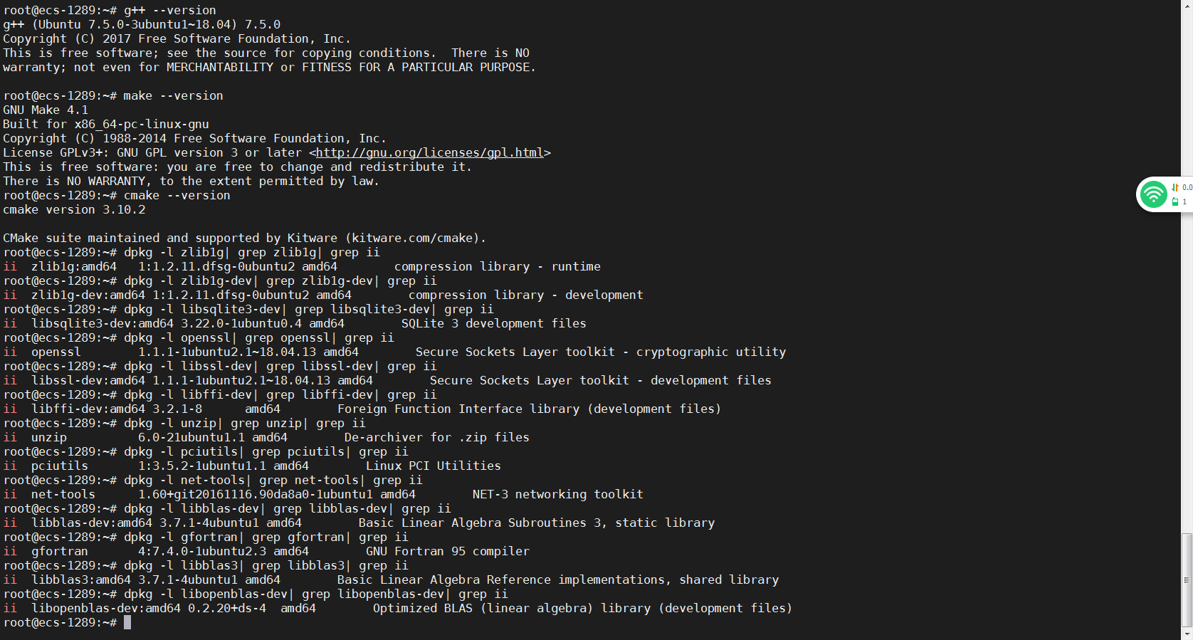 sudo apt-get install -y gcc g++ make cmake zlib1g zlib1g-dev openssl libsqlite3-dev libssl-dev libffi-dev unzip pciutils net-tools libblas-dev gfortran libblas3 libopenblas-dev libncursesw5-dev