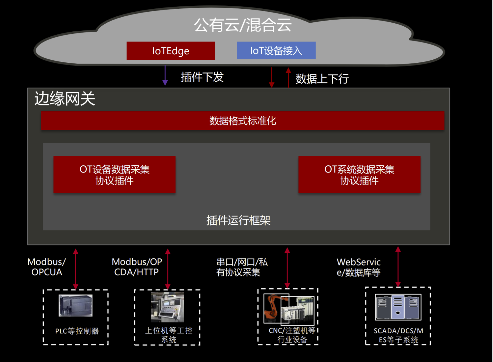 协议插件部署: 支持伙伴开发的插件,通过IoT边缘远程部署到客户现场 的边缘服务器上。 协议数据采集: 支持Modbus-TCP、OPC-UA等工业协议接入,对接PLC、 机床等工业设备进行数据采集。 数据灵活流转: 按照标准物模型格式上云,也可以流转到指定的应用。