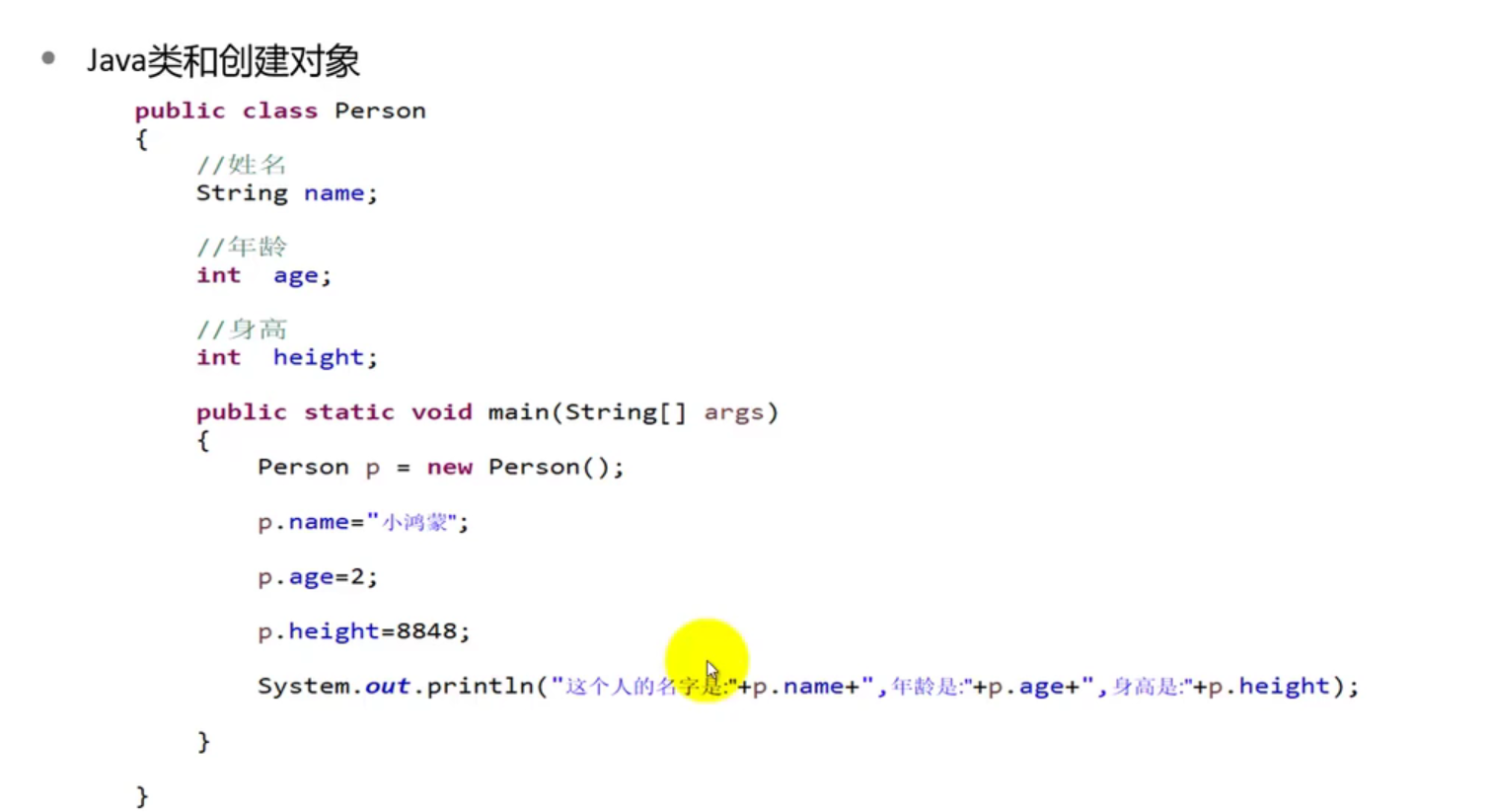 如下图是先创建了一个Person类,再在main函数中(主函数)进行new操作,即创建对象(对象都有了,那还不想干啥干啥嘛~),给她起了名字、给她设置个身高、设置个年龄,这些都是对象的属性而设定具体值的过程是给对象的属性进行赋值。