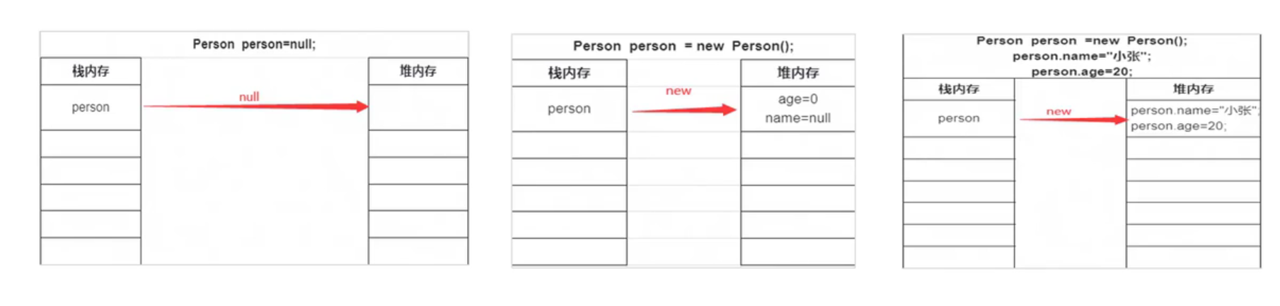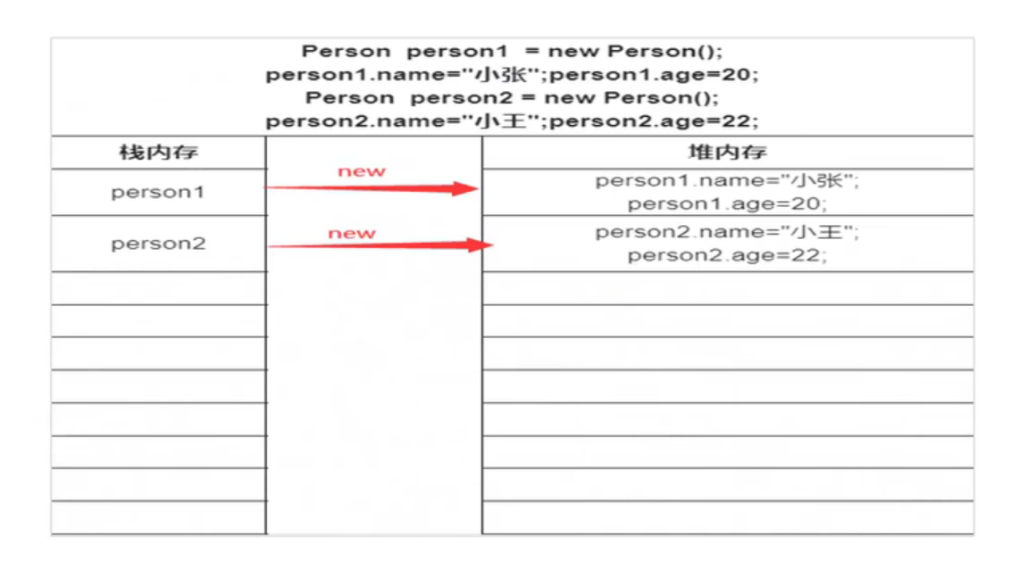 首先是person在栈内存中被声明,然后通过new关键字,在堆内存申请开辟内存空间,并且实例化赋初始值(age=0,name=null),最后给对象的属性赋值(person.name=“小张”;person.age = 20;)