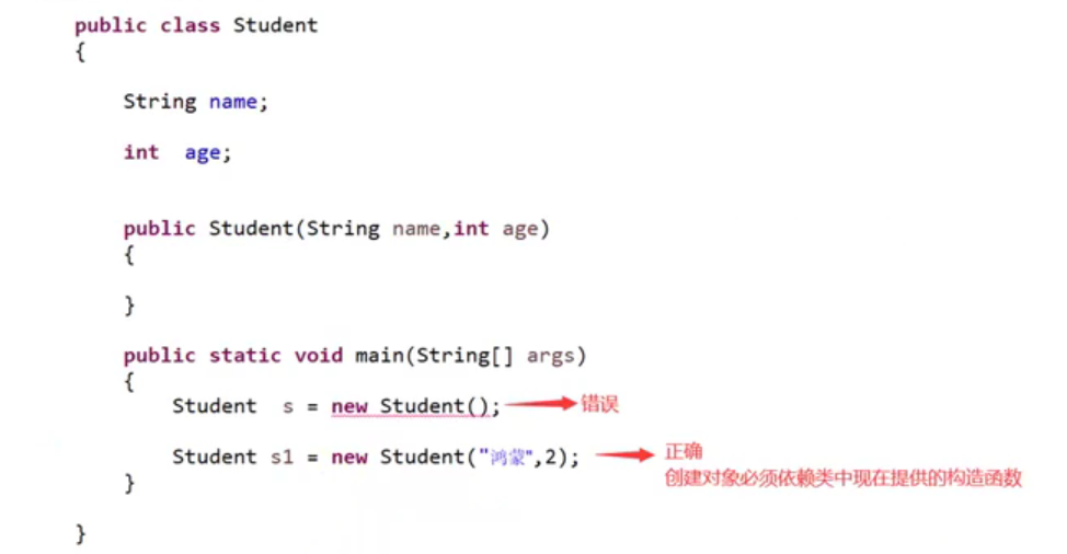 (4)创建对象的时候,所需要的参数需要与构造函数中的参数一一对应,构造函数里有几个参数就要提供几个参数;