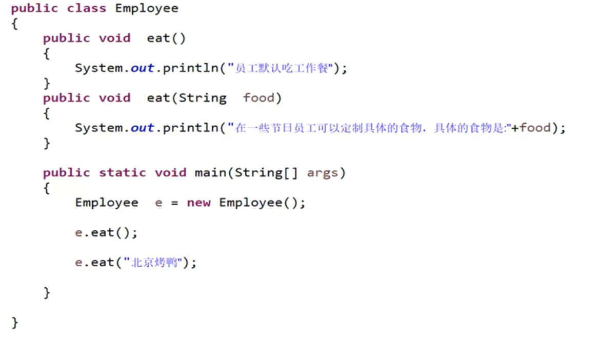 一个类中如果有多个方法名称相同(与修饰符无关),并且参数列表不同,返回值类型不同,这类形式称为方法的重载,即同一个方法不同的使用形式得到不同的实现结果(一虾多吃的既视感),如下图示例: