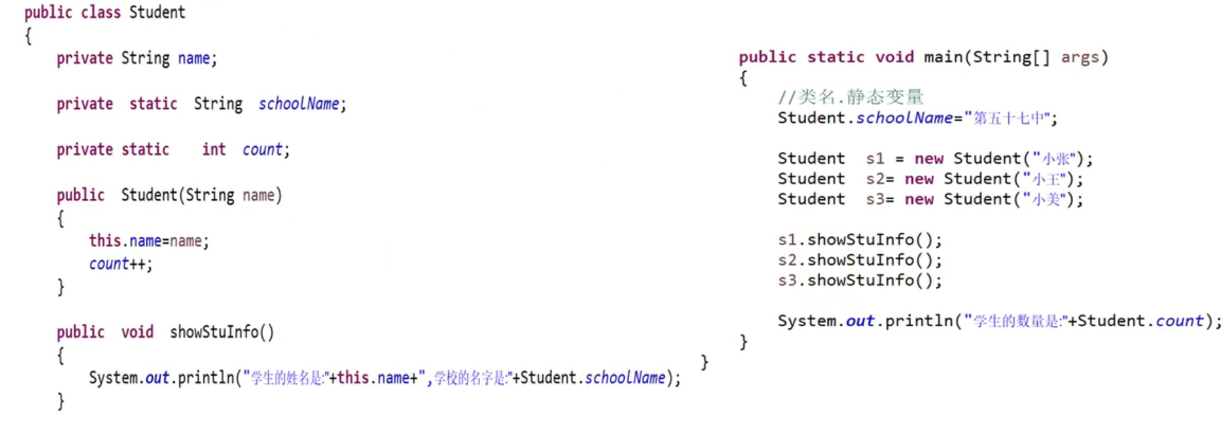 由static关键词修饰的变量也称为静态变量或者类变量(从名字可以看出静态变量是属于类的),被所有的对象所共享,在内存中只有一个副本,当且仅当类初次加载时会被初始化(意味着最先被初始化),通过类名就可以直接调用(建议使用),也可以通过对象名.静态变量名进行调用。