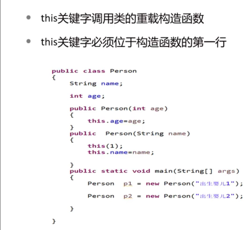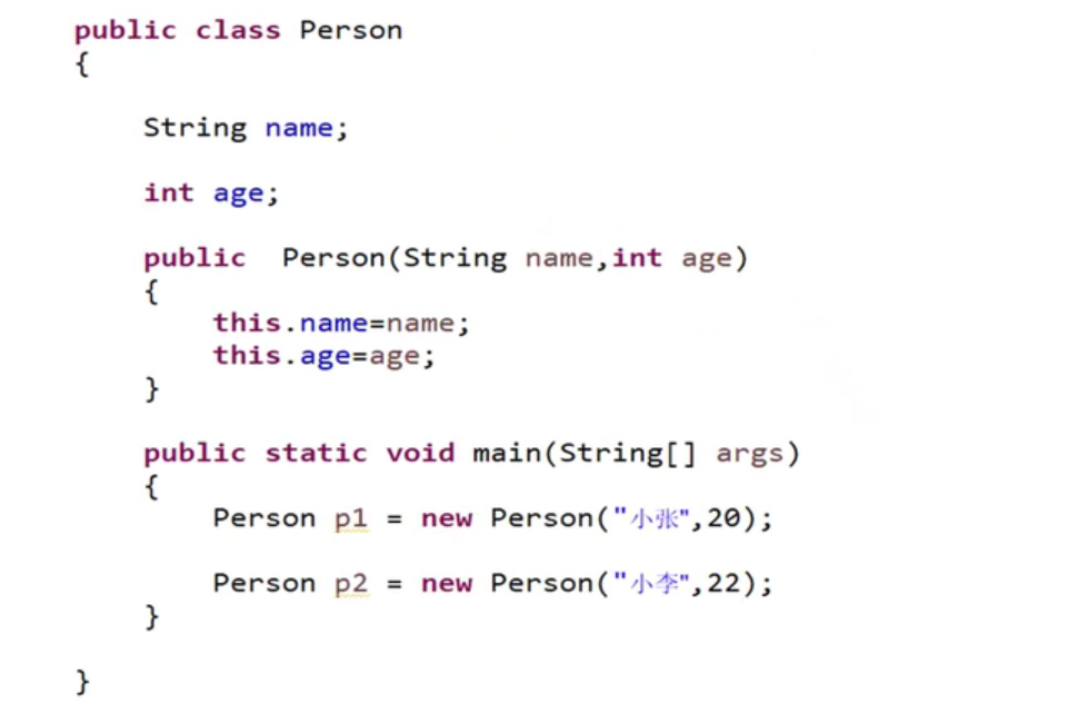 下面示例,即表示为p1.name = “小张”;p1.age=20;p2.name = “小李”;p2.age=22;可以看出this指代的是调用各自有参构造方法的对象的引用。
