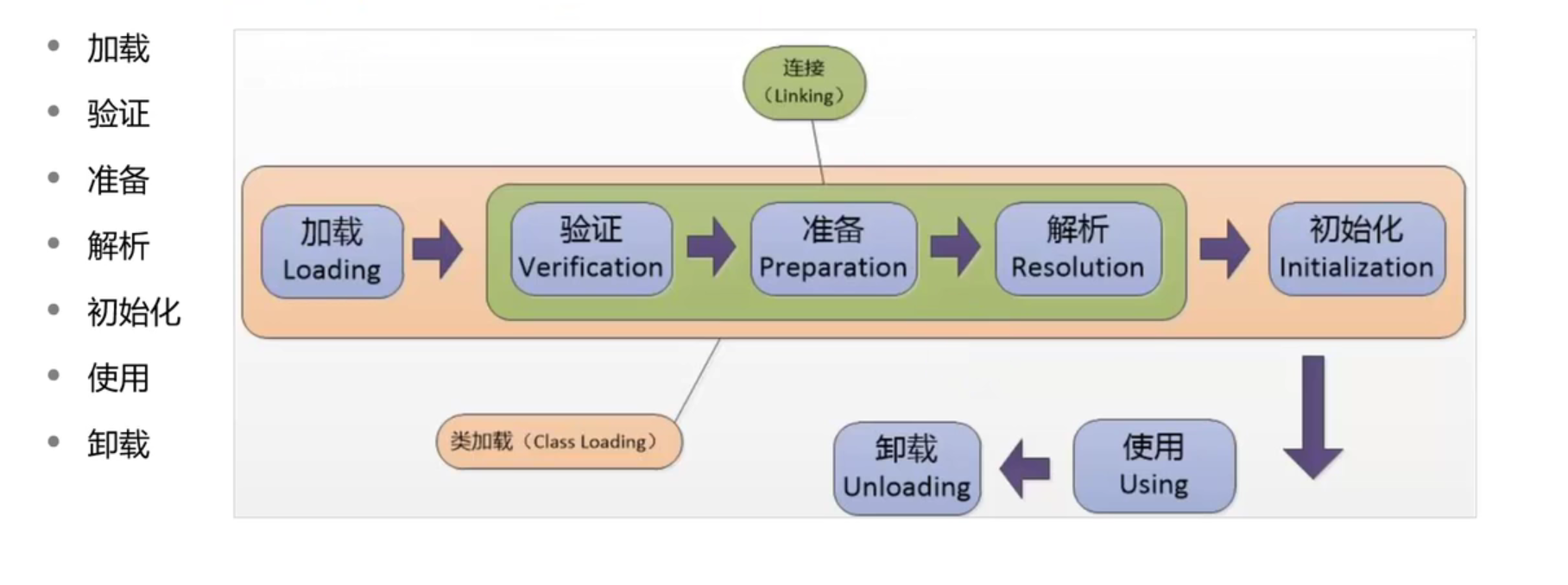 (6)使用:分为直接引用(会触发类的初始化,比如new一个实例对象、访问和设置静态变量、访问类的静态方法、反射、启动类的入口main方法)和间接引用(引用常量、定义数组);