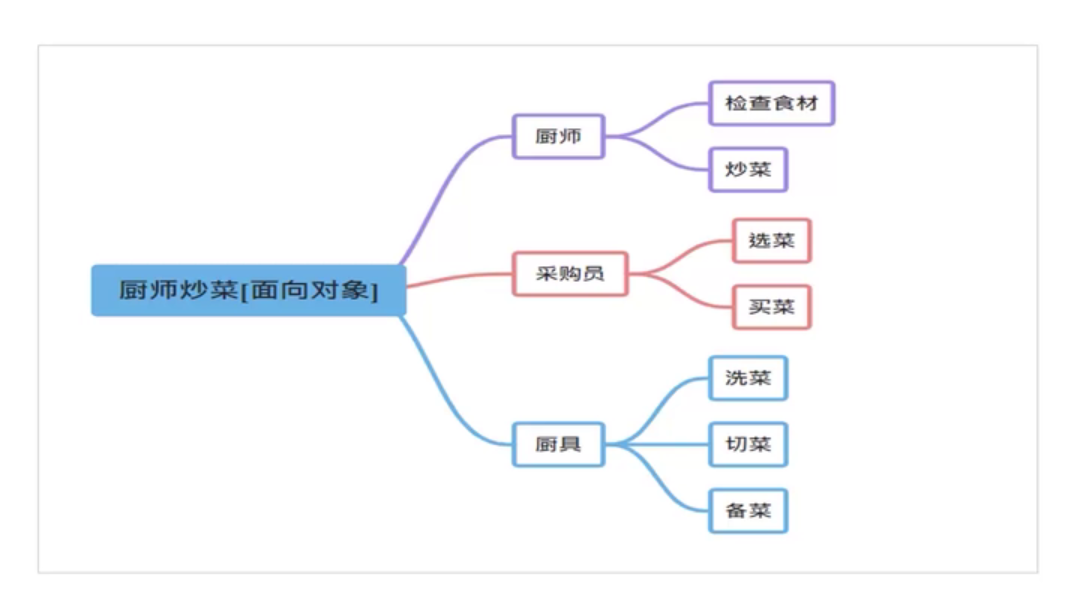 厨师炒菜==》将这件事分为三个方面去做(厨师、采购员、厨具)