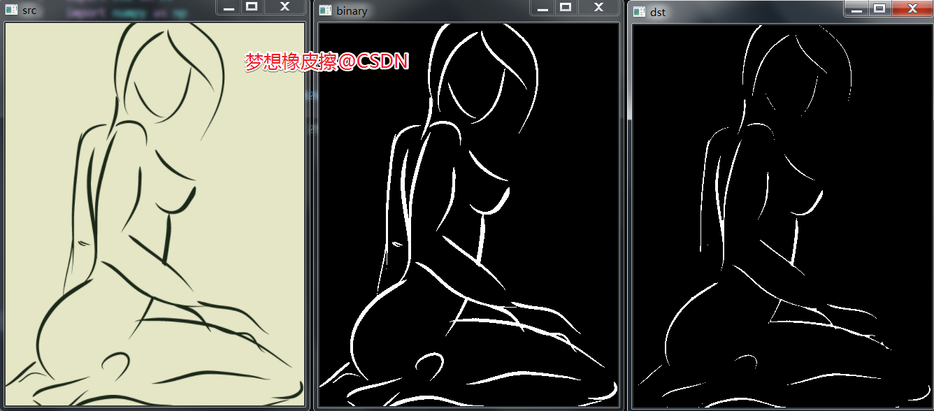 运行之后效果依次如下,从左到右分别是原图,二值化图,腐蚀图。