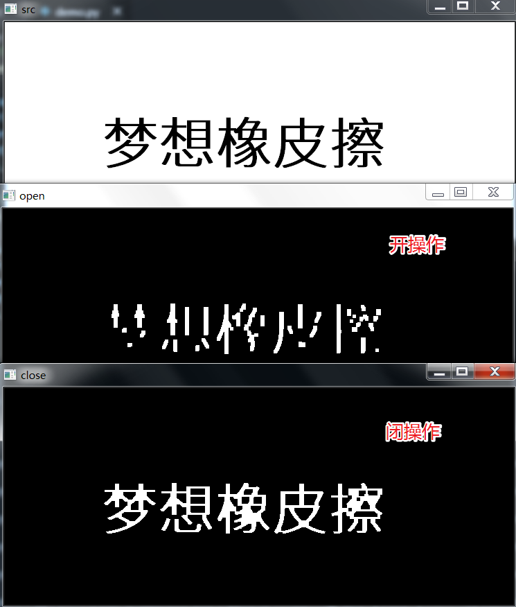 比操作 = 先膨胀,再腐蚀,作用:填充前景物体中的小洞,抹去前景物体上的小黑点。总结下来就是:填充小的封闭区域。