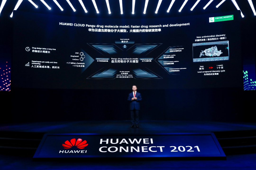 9月23日,华为全联接2021隆重开幕,华为高级副总裁、华为云CEO、消费者云服务总裁张平安发表“深耕数字化,一切皆服务”主题演讲,并重磅发布了华为云盘古药物分子大模型。