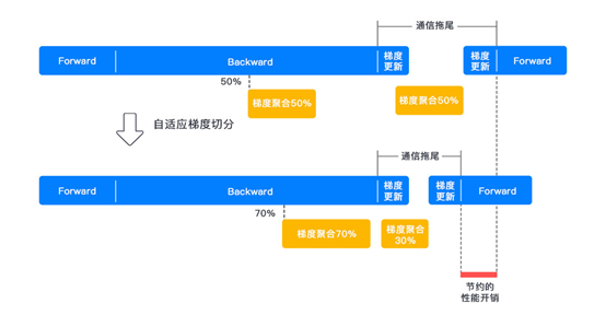 大部分同步更新算法要求,在下一轮迭代正向计算开始前,各计算节点间需要同步好梯度数据,完成权重更新。这就会导致在两轮迭代之间产生等待间隙,即通信拖尾。