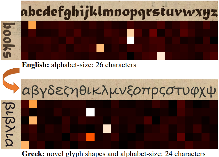 图1 用于文本识别的视觉匹配。当前的文本识别模型从预定义(固定)字母表中学习特定于字符形状(字形)的判别特征。我们训练我们的模型来建立给定字符字形(顶部)和要识别的文本行图像(左侧)之间的视觉相似性。这使得模型高度适应未见过的新字形、新字母表(不同的语言),并且无需进一步训练即可扩展到新的字符类,例如英语→希腊语。更亮的颜色对应于更高的视觉相似性。