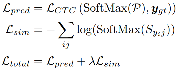 使用CTC损失监督字形示例P,以将预测与输出标签对齐。还在每个位置使用辅助交叉熵损失(L sim)来监督视觉编码器S的相似性映射输出。使用真实字符边界框来确定每个字符的空间跨度。总体训练由以下两部分损失组成。