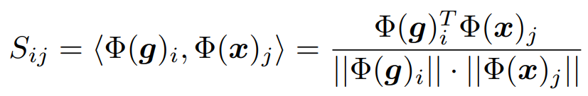 使用视觉编码器 Φ 对字形 g 和文本行 x 进行编码,并且生成相似图 S ,表示每一个字形和文本行的每一个位置的相似度。使用余弦距离计算相似度。